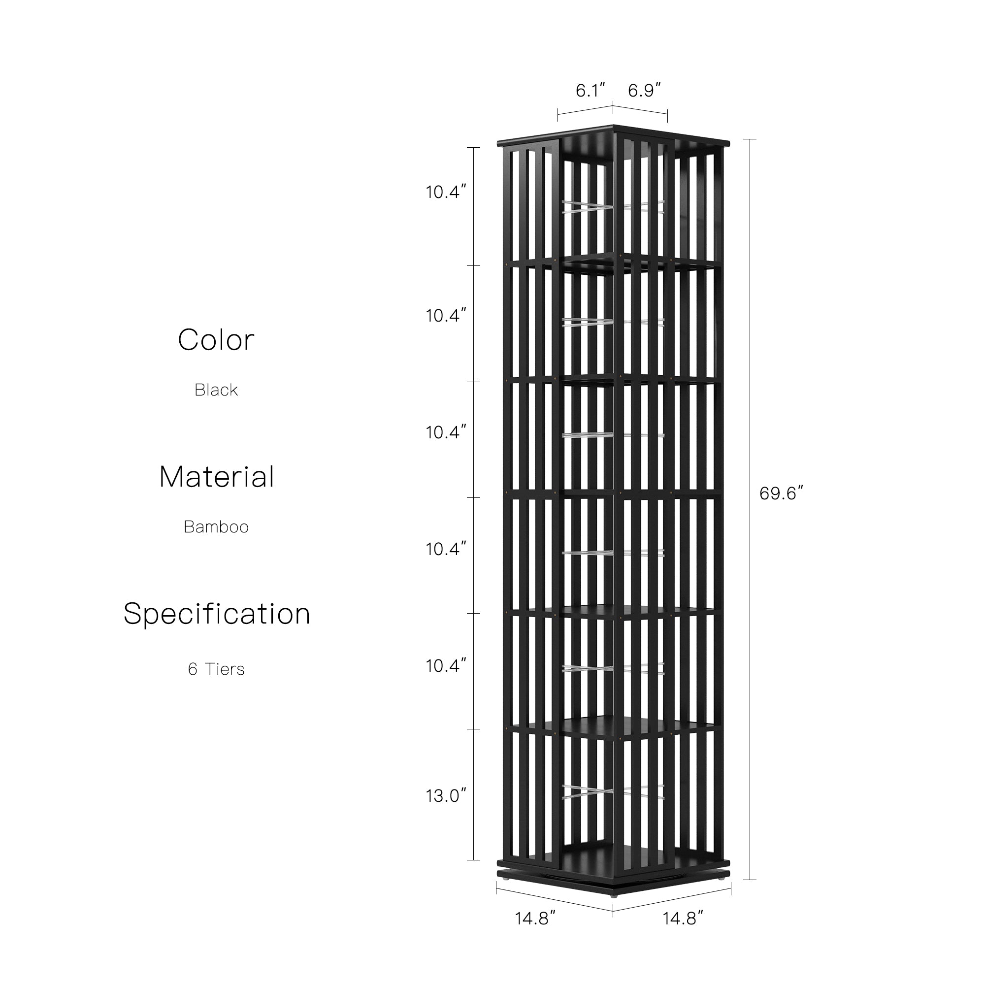 • Six-tier square design that maximizes vertical storage while saving space