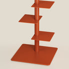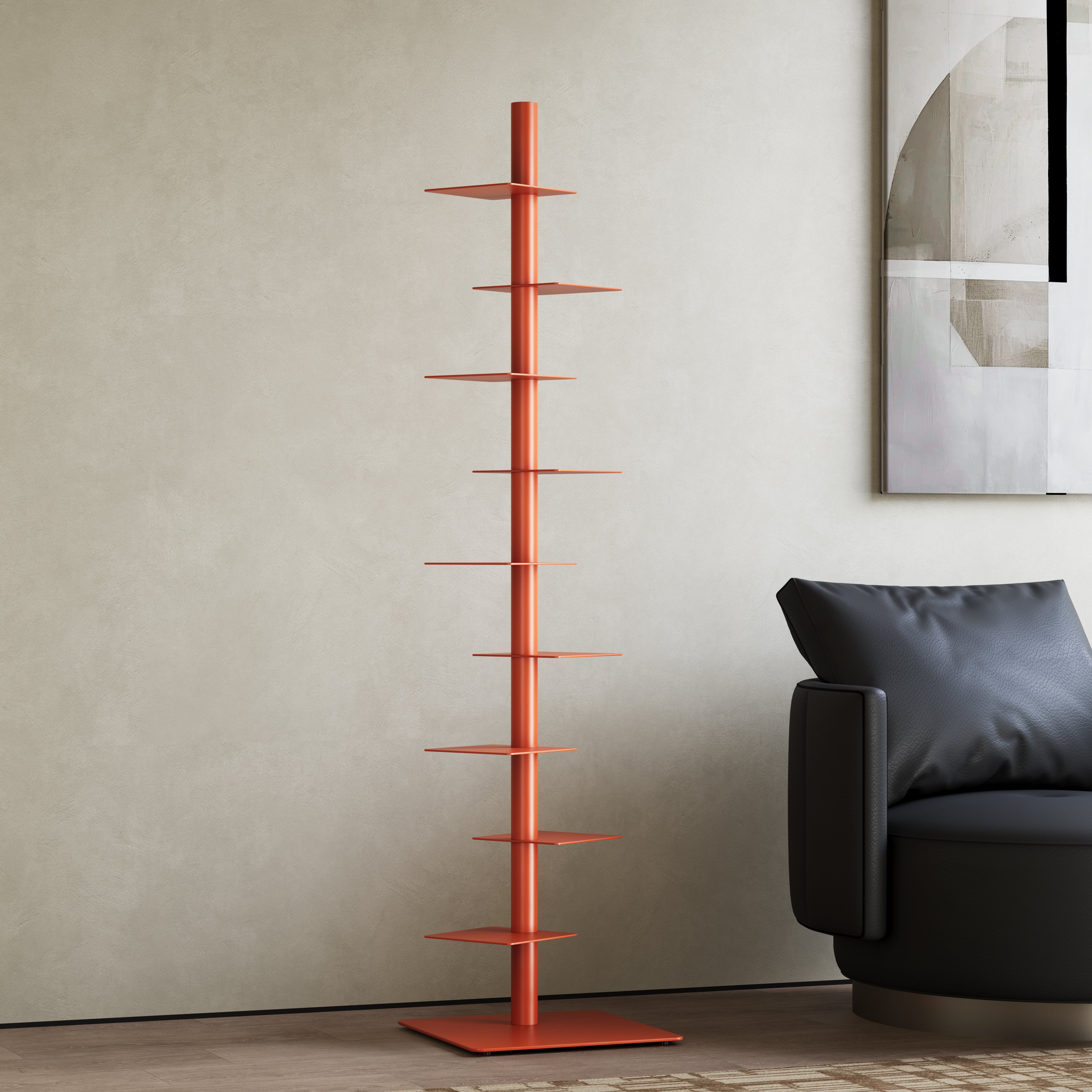 • A single rising column anchors the piece, maximizing vertical space with a sculptural presence